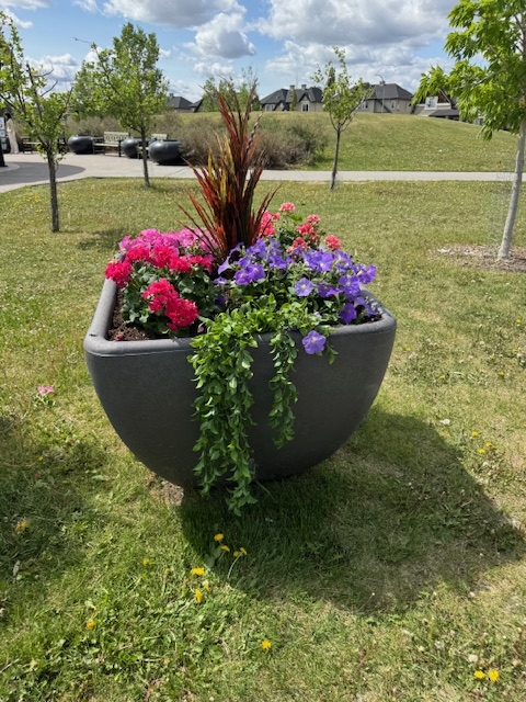Skyview Ranch now has 44 large pots and planters spread out on the various parks, gardens, green spaces and traffic circles of the community. These add much beauty to our area from spring through summer and into autumn months.